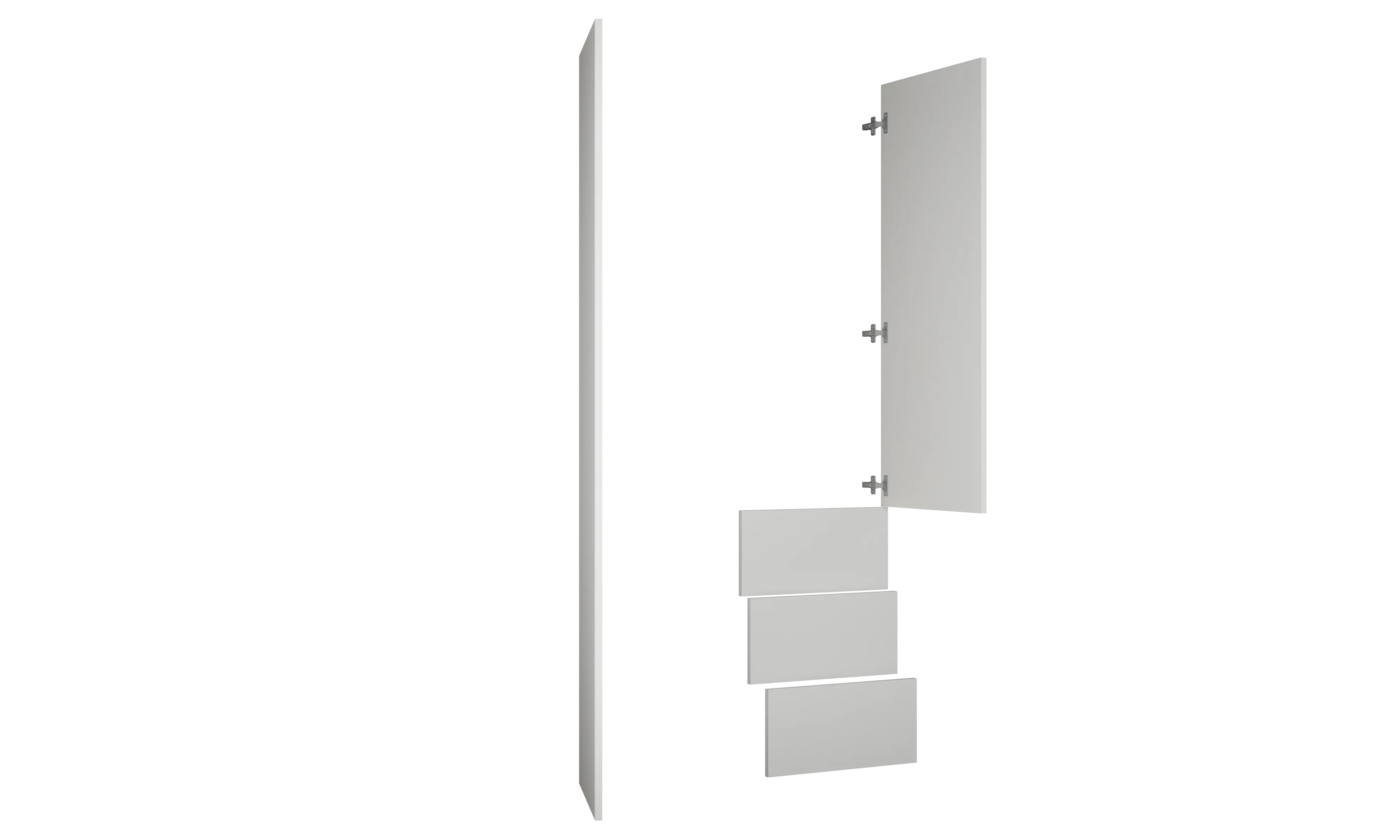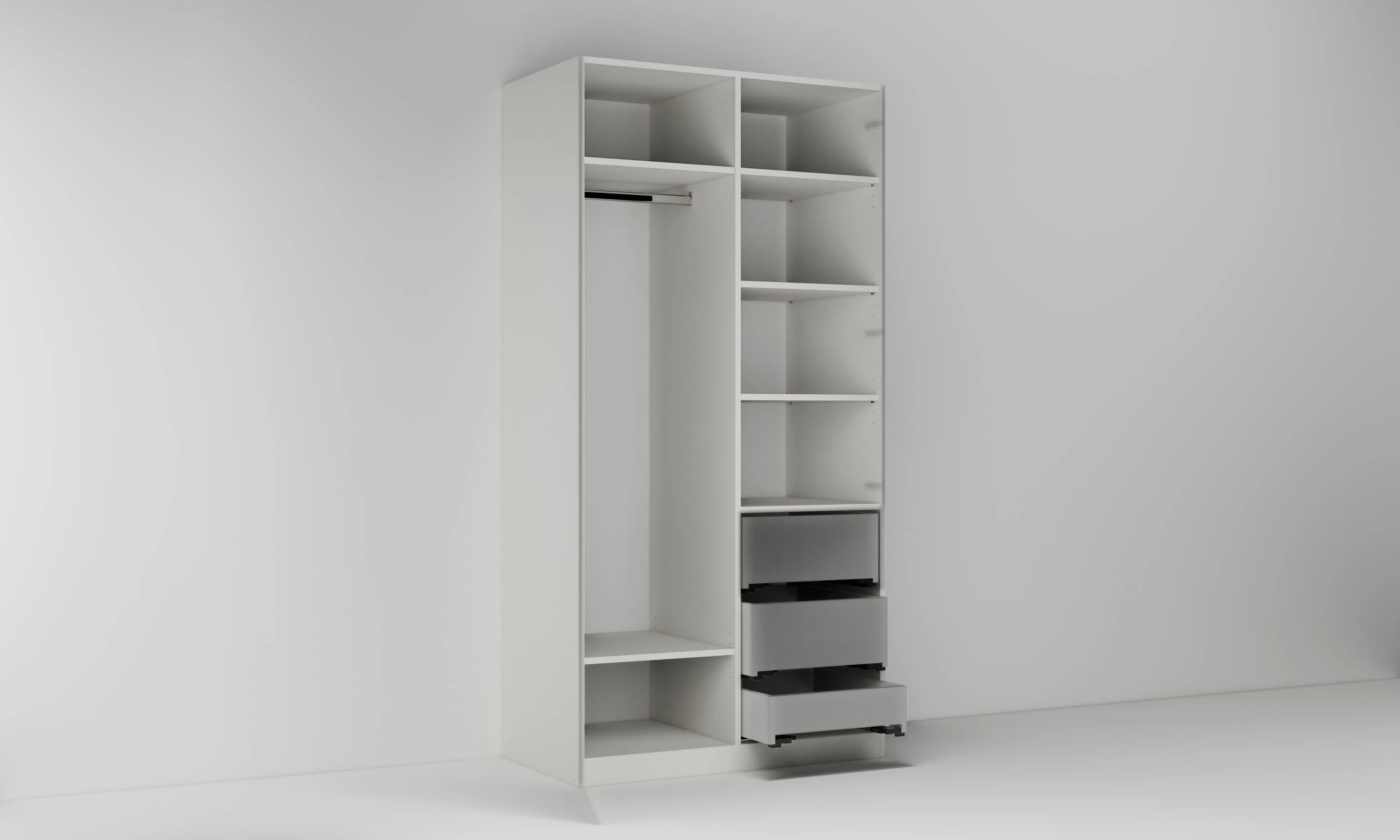 Vysoká skříň se dvěma dvířky a třemi zásuvkami, šatní tyčí a policemi